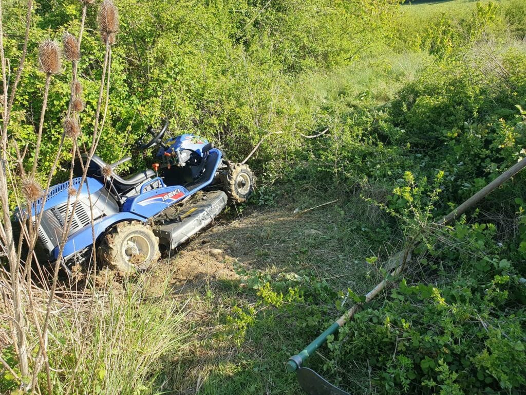 Tijd om rustig te lunchen was er ook niet: gauw door want het moeilijkste deel, boven op de helling, moest nog gebeuren. En tegen 16.00 uur was het dan zover… Rob kwam wandelend naar beneden en melde zich bij mij: hij ging even naar de buurman om te vragen de kart uit de greppel te trekken. Oeps! Dat stond niet op het programma. Gelukkig was Rob ongedeerd, maar toch wel een beetje geschrokken. Hij had niet gezien dat er onder de struiken een abrupt steil stuk in de helling zat: